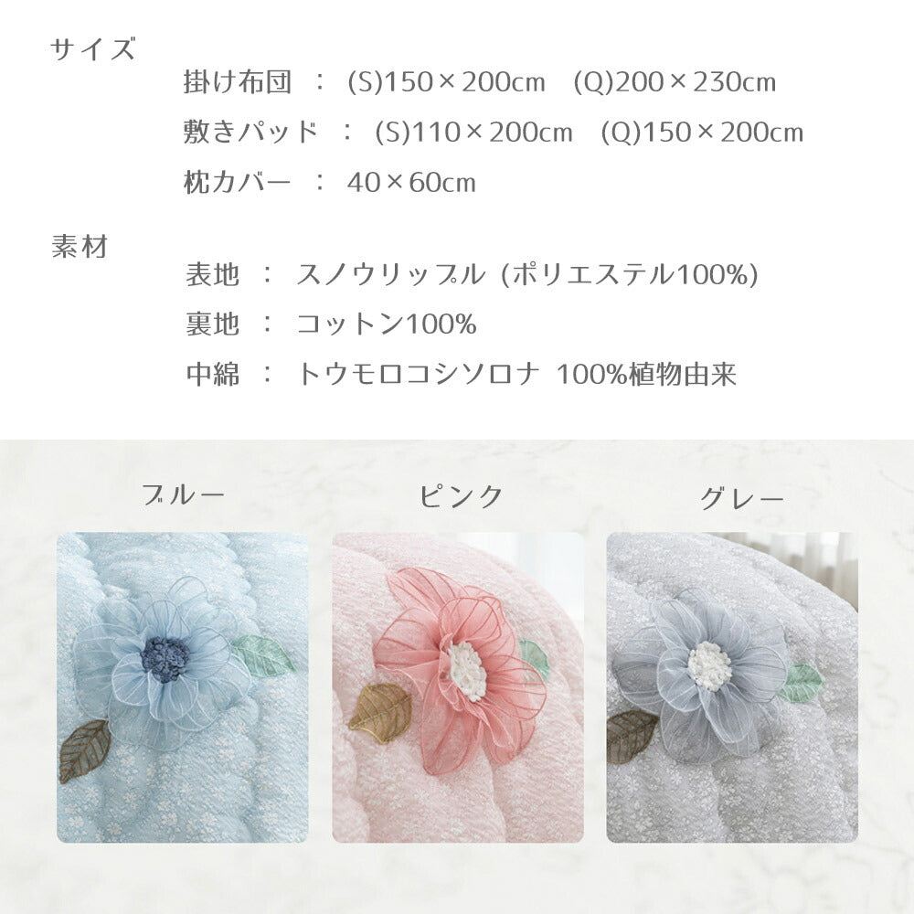 | サイズ | 掛け布団: (S)150×200cm (Q)200×230cm(±5cm) 敷きパッド:(S)110×200cm (Q)150×200cm(±5cm) 枕カバー:40×60cm(±5cm) |